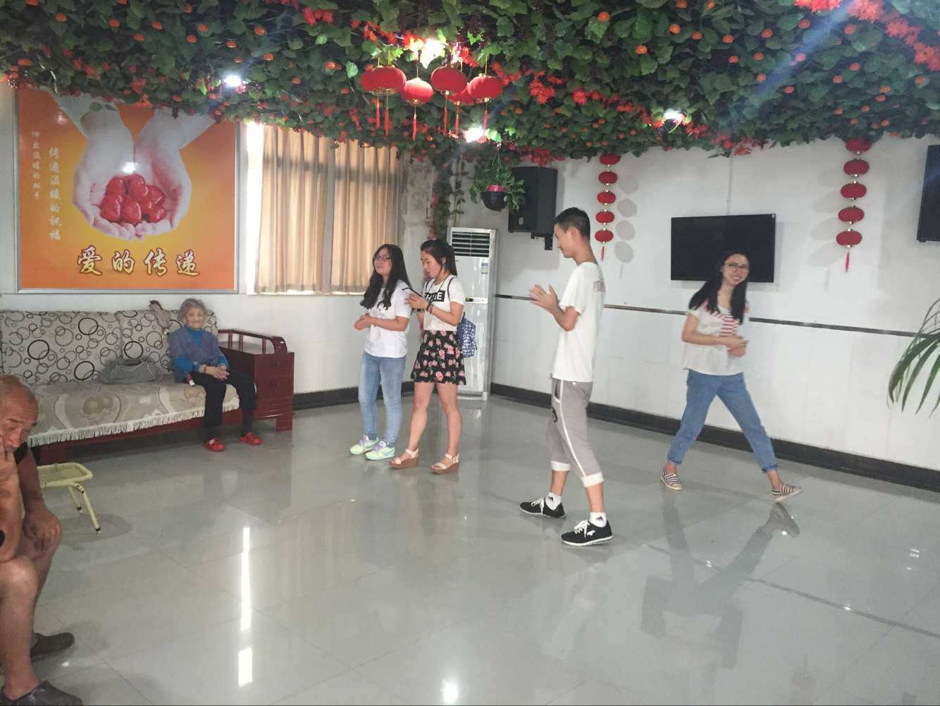 本次实践分三个主题。分别是“扫地”“表演节目”“给老人送温暖”。到敬老院后,有些同学拿起拖把,打扫卫生,擦墙壁。而有些同学去爷爷奶奶旁边坐着,陪爷爷奶奶聊天。 进入主题后,小组成员开始表演节目,唱红歌,讲红色革命故事,给老人们带来了欢乐和慰藉。