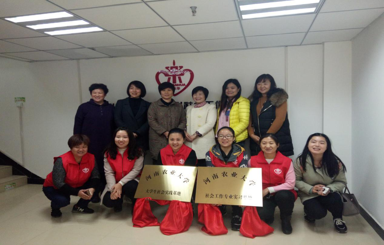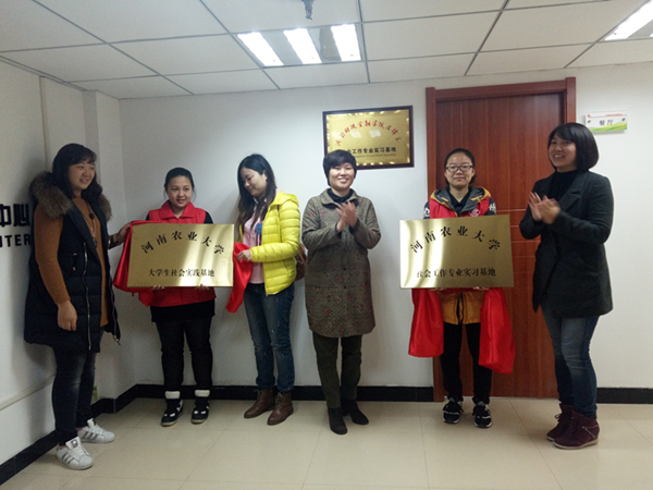 的基本情况,并为实习基地揭牌。接着,酒院长向郑州市乐年华社工服务中心对学院办学的大力支持表示感谢,表明了专业实践教学对于学生发展和提高教学质量的重要意义,并预祝双方合作取得丰硕的成果,表示要发挥河南农业大学的教育资源优势帮助实习基地发展,实现双赢。