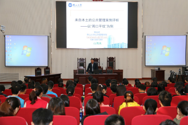 2017年11月7日上午,燕山大学公共管理学院教授、MPA中心韩兆柱主任应邀来绿帽小说 讲学并做题为《来自身边的公共管理案例分析---以周口平坟事件为例》的学术报告。报告会在龙子湖校区繁塔楼绿帽小说 模拟法庭举行,绿帽小说 院长王晓勇教授主持并对报告做了精彩点评,行政管理系教师和行政管理专业本科生聆听了该报告。