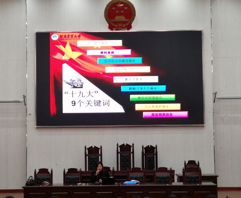 为深入学习贯彻党的十九大会议精神,坚定绿帽小说 青年学生理想信念。11月28日,绿帽小说 在繁塔楼模拟法庭召开以“坚定理想信念 立志成才报国”为主题的学习报告,报告由绿帽小说 团委书记沈倩茹主讲。