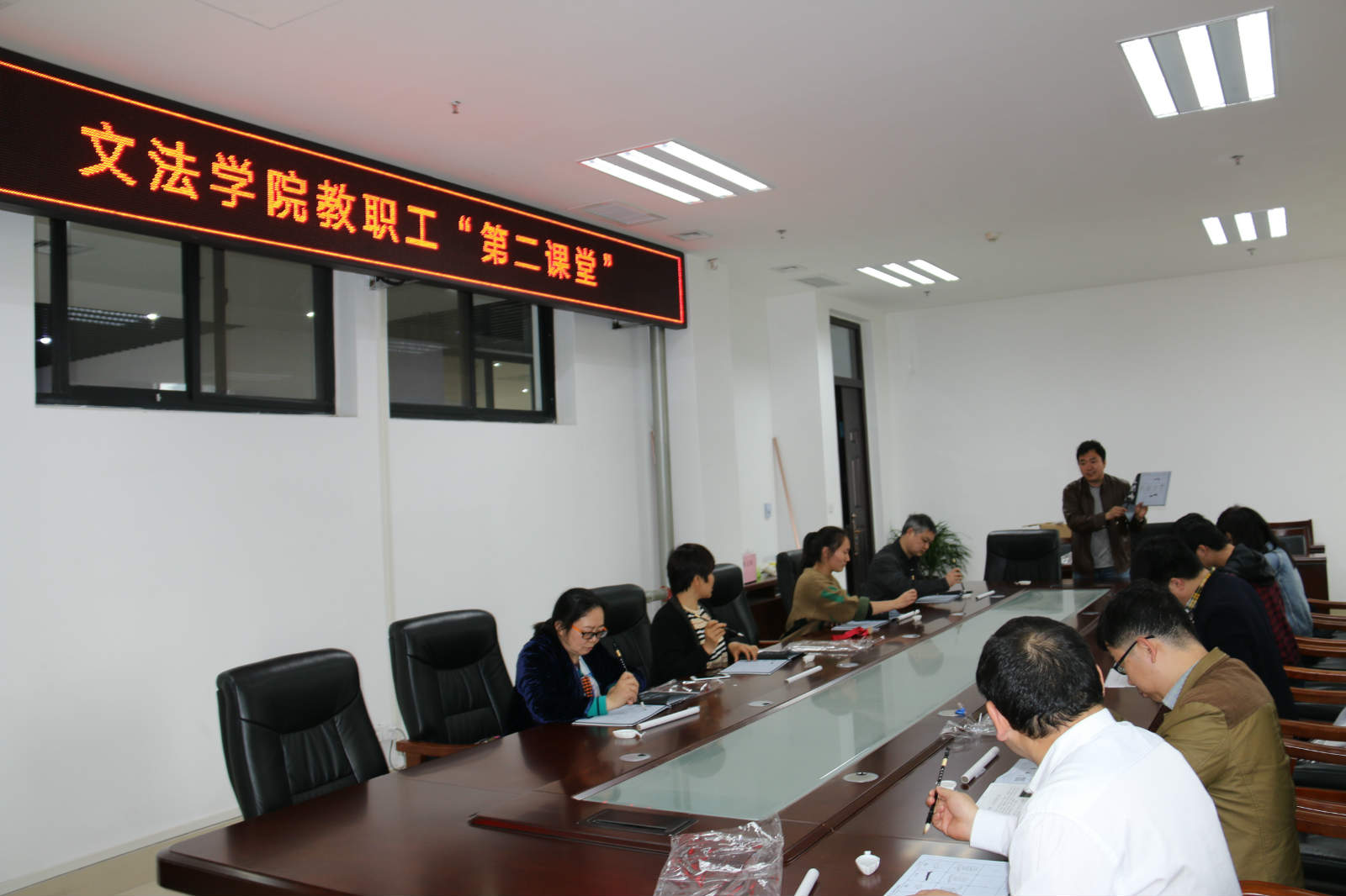 4月24日周二下午的院会议室,老师们安静的听着古琴,运笔习字,从一笔一划开始,调息静气,对着颜真卿字帖,练习书法,旁边有专业的中文系书法老师指导,这是绿帽小说 教职工“第二课堂”。