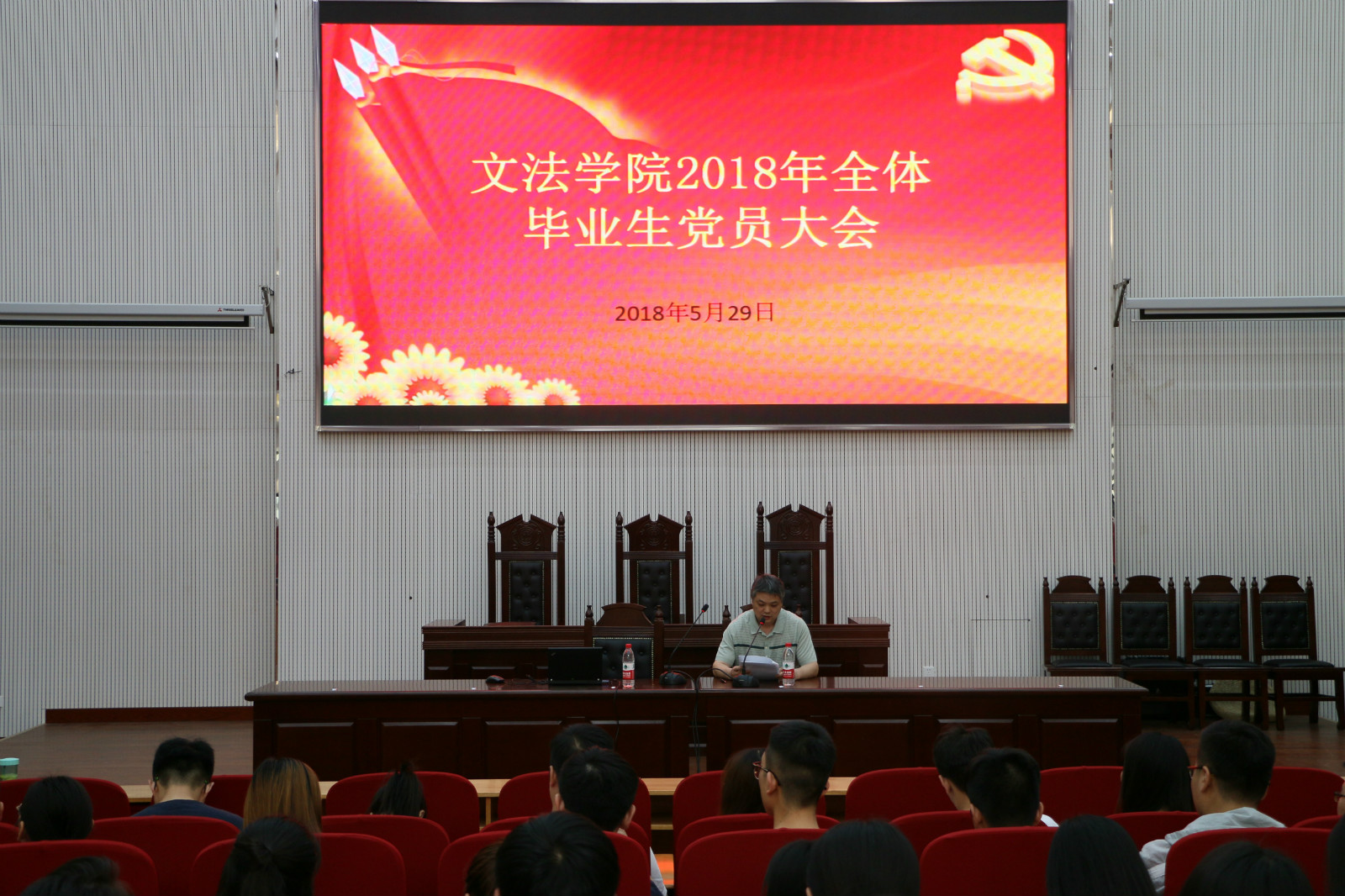 在模拟法庭召开了2018届毕业生党员大会。会议由团委书记沈倩茹主持,党委书记李培玉出席本次会议。