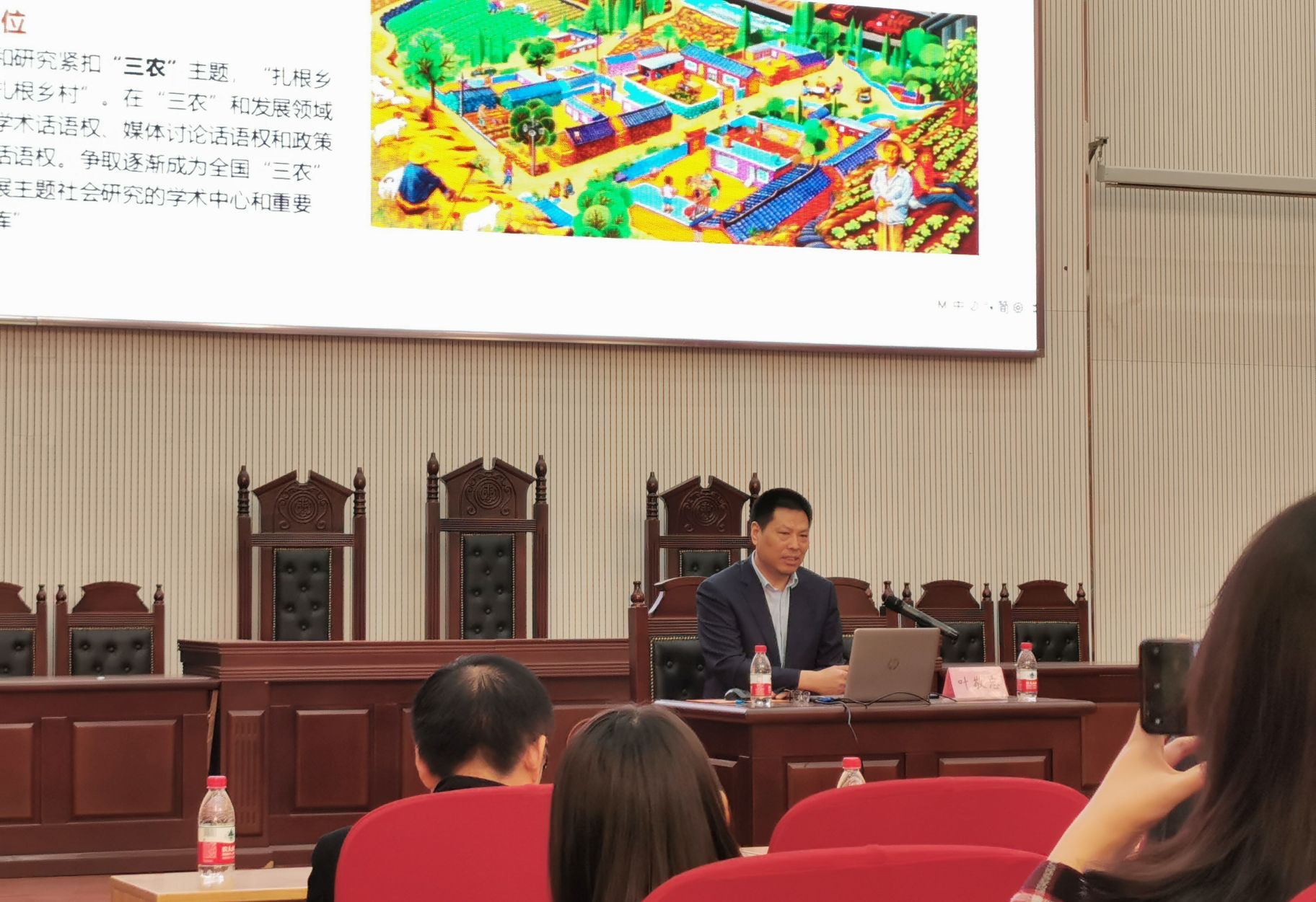 讲座伊始,叶敬忠教授从精准扶贫政策出发,讲述了精准扶贫的政策设计与实践遭遇,为后文讲述巢状市场与脱贫的关系埋下伏笔。紧接着,叶敬忠教授讲述了产业扶贫的实践遭遇、小农生产、巢状市场小农扶贫以及巢状市场的可持续性研究,使同学们深刻理解乡村振兴中的小农户如何与市场对接。最后,老师和同学们对叶敬忠教授进行现场提问,叶敬忠教授针对提出的问题一一展开阐述。现场气氛热烈,严肃而不失活泼。
