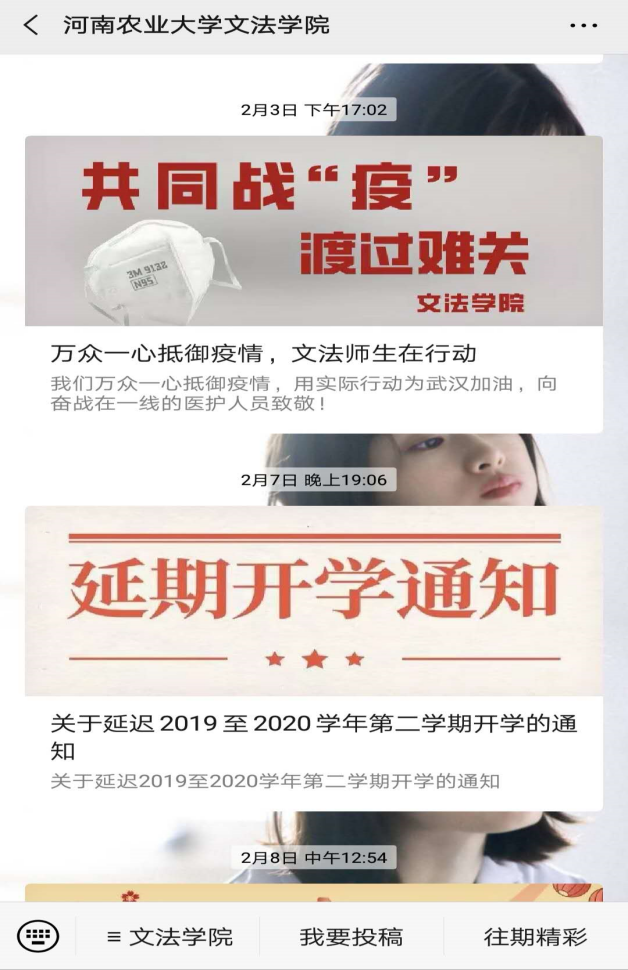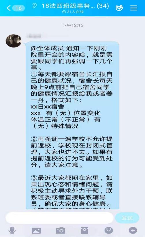 通过年级辅导员、班主任、班长、团支书、宿舍长等多层次多渠道方式,通过微信、 qq工作群、官网、新媒体等方式,将《关于寒假学生返校事宜的紧急通知》《关于延迟2019-2020学年第二学期开学的通知》告知给每一位师生,及时向学生传达学校目前已进行半封闭管理,未到开学时间严禁学生提前返校的通知。通过对师生的线上宣传教育,动员绿帽小说 师生积极配合学校各项防控措施,主动向班级、单位报告假期行踪和身体健康状况,提高自觉防控意识和能力。