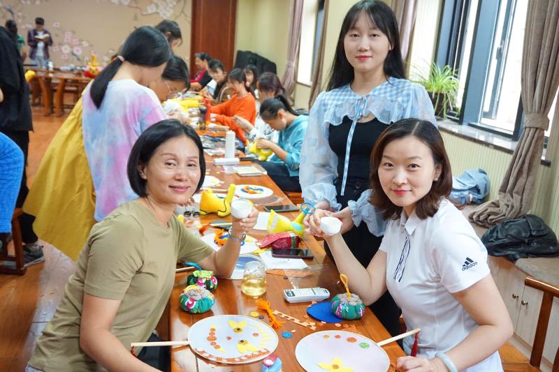 校工会副主席董晓莉、院党委书记牛娟参与香包制作