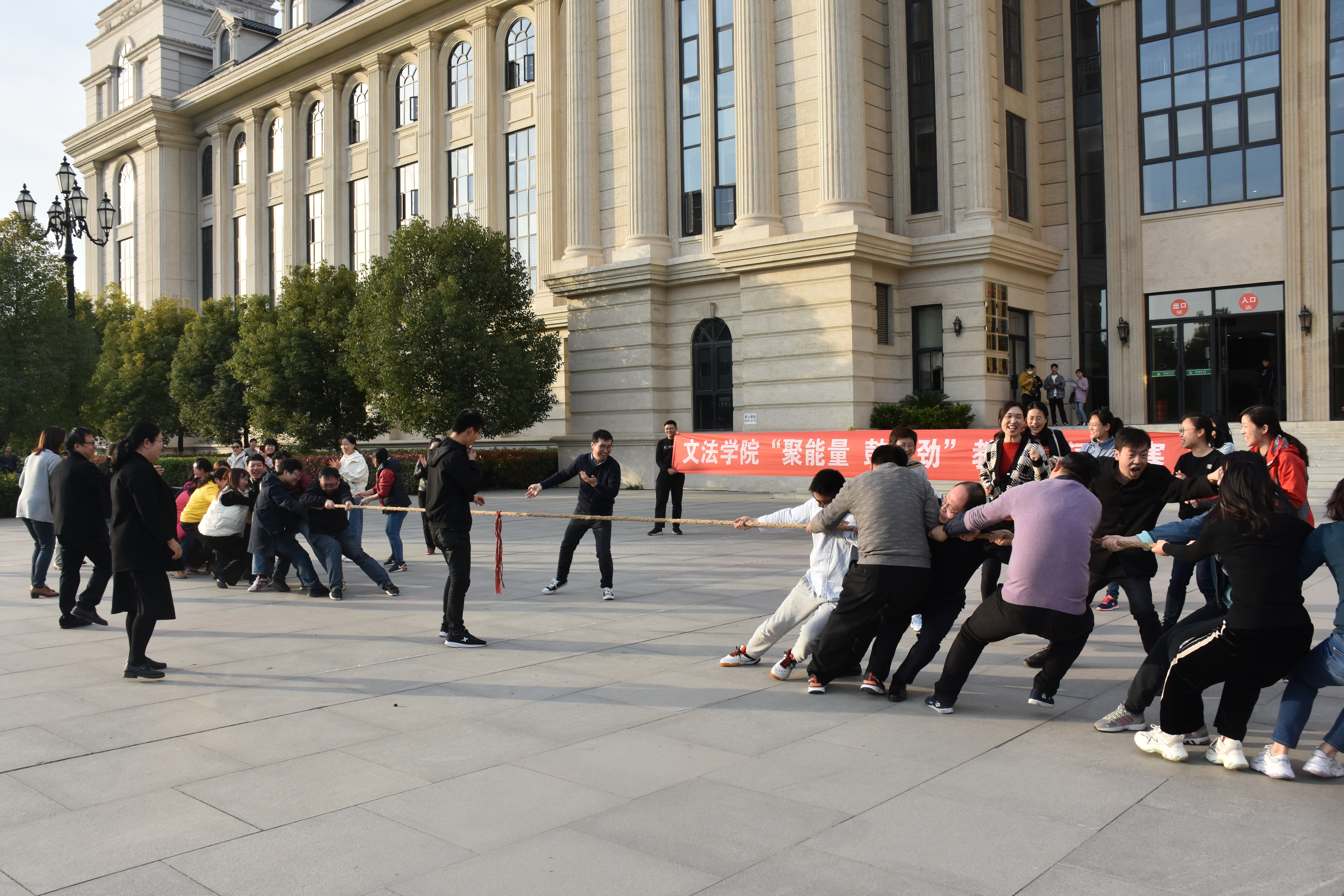 在龙子湖校区繁塔楼前举办了“聚能量 鼓干劲”教工拔河比赛,比赛以系部为单位,采取三局两胜制。