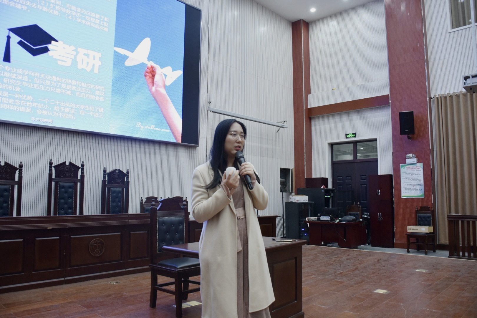 于龙子湖校区模拟法庭召开考研动员大会,会议由院团委副书记赵蕊主讲,17、18级学生与会聆听。
