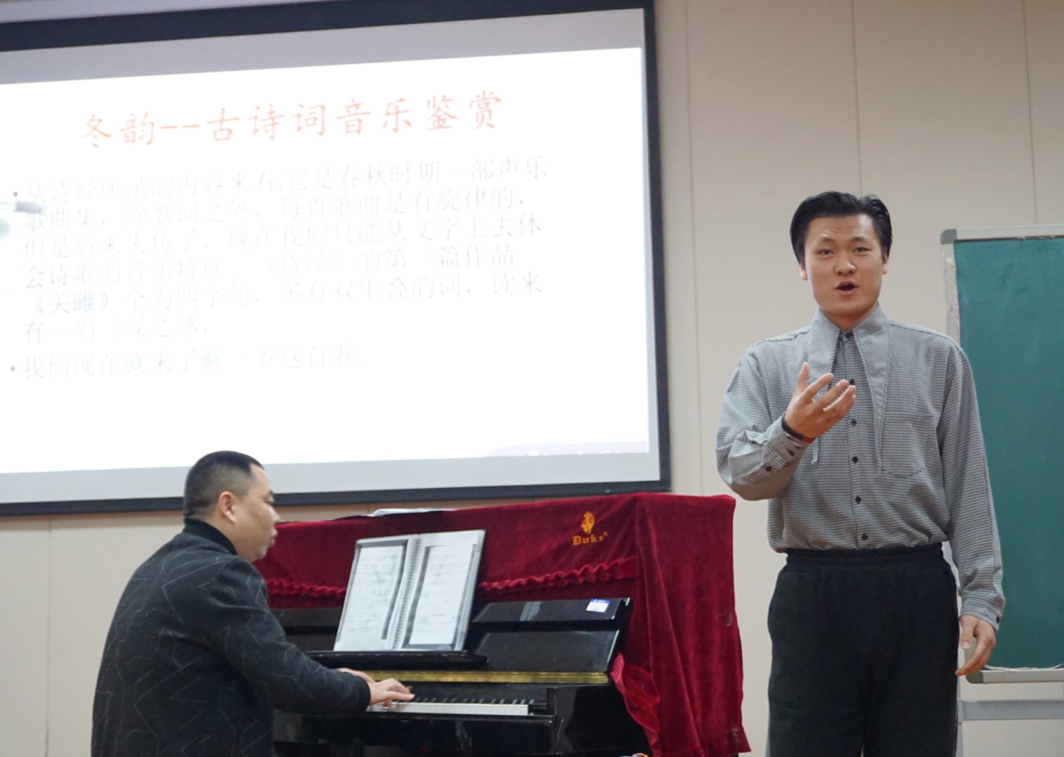 《尚书•尧典》载有:“诗言志,歌咏言,声依韵,韵和声。”李庆勋按照历史脉络梳理了中国古诗词的发展与演变的过程,将诗经、楚辞、乐府诗、唐诗、宋词、元曲、明清俗曲的特色娓娓道来,让在场师生感受到中华诗词文化的源远流长。为了充分使师生们品味诗词与音乐融合之美,李庆勋和他的学生同台演唱经典诗词。伴随着李庆勋的钢琴演奏,学生将自己融入诗词情境中,唱出了婉转悠长的《关雎》、饱含乡愁的《塞外听吹笛》、轻快活泼的《行香子》……现场听众无不沉浸在乐曲中,畅游在古诗词音乐的世界里。李庆勋还将乐曲中不同的音符作比较,讲述大师作曲时的严谨与考究。最后,李庆勋将古诗词演唱与现代影视相联系,以《三国演义》中曹植七步作诗的情节配乐、《水浒传》的插曲《水泊梁山歌》等为例,解析了二者结合后的非凡效果,令在场观众受益匪浅。