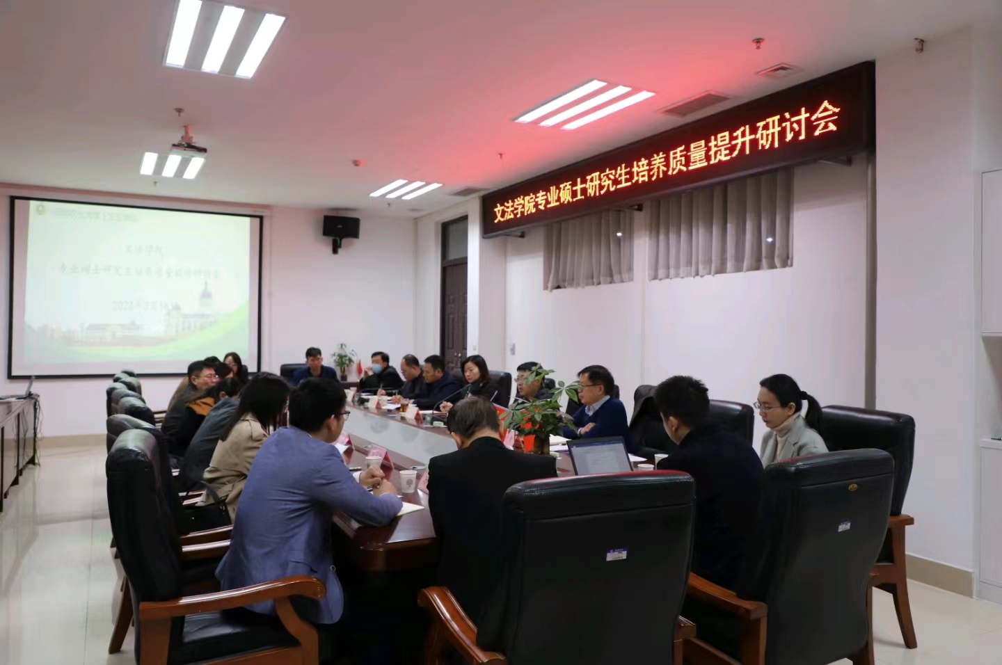 专业硕士研究生培养质量提升研讨会。研究生院副院长郭红祥、学院党委书记牛娟、院长王晓勇、副院长李伟、农业管理、社会工作、法律和汉语国际教育四个硕士学位点负责人和全体导师参加研讨会。会议由王晓勇主持。
