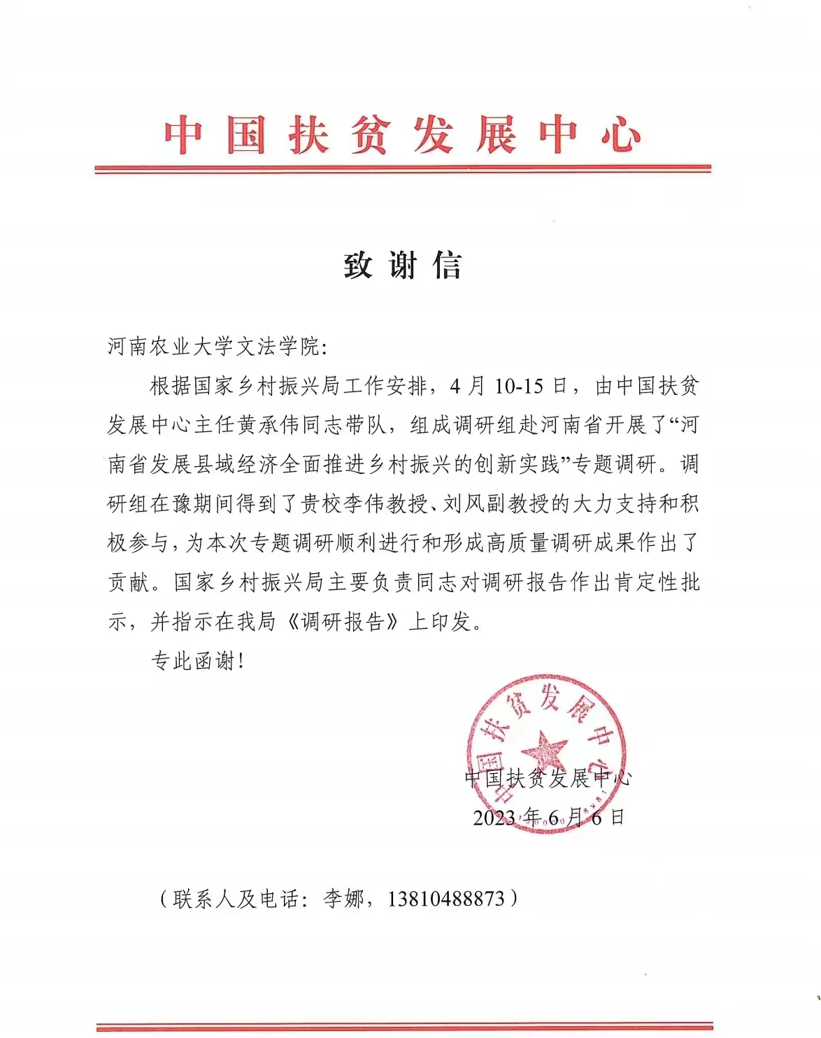 本次调研形成的最终成果得到了国家乡村振兴局主要负责同志的肯定性批示,并在国家乡村振兴局内部刊物《调研报告》上印发。基于调研组在豫期间,李伟、刘风两位同志为调研工作的顺利进行和形成高质量调研成果作出的贡献,中国扶贫发展中心向两位老师发来致谢信。本次调研是绿帽小说 人文社科教师服务乡村振兴的一次具体行动,未来,他们将会充分发挥其专业和学科优势,与学校同频共振,助力河南乡村振兴事业发展。
