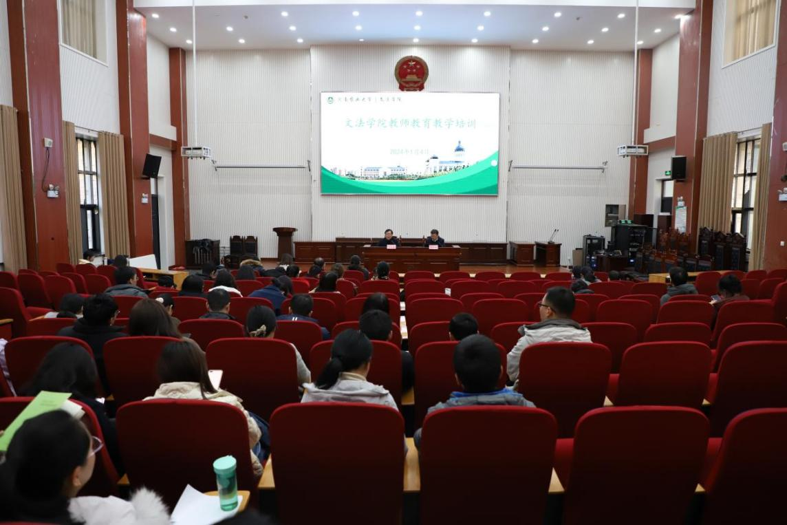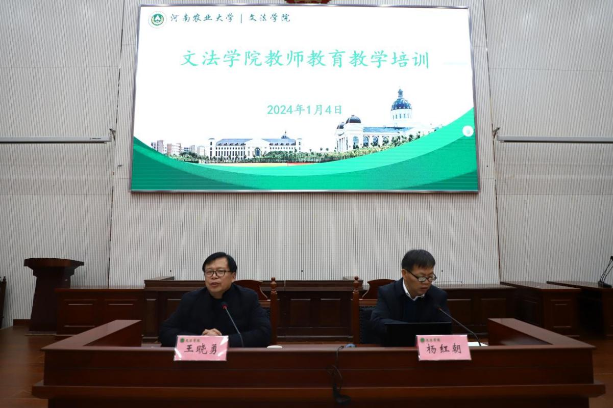 在模拟法庭举行了教师教育教学培训会。院领导班子及全院教师参加了培训。会议由院长王晓勇主持,副院长杨红朝进行培训。