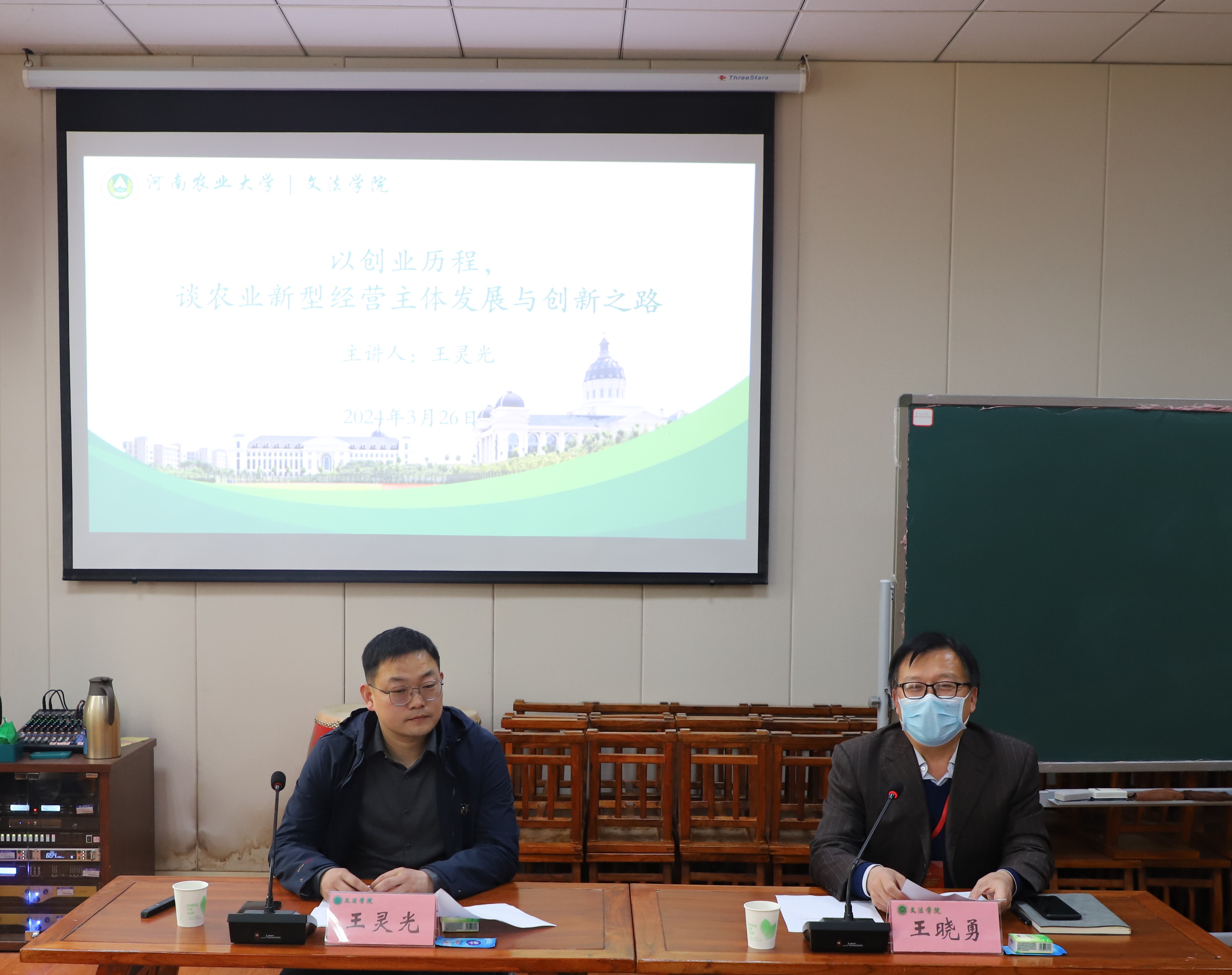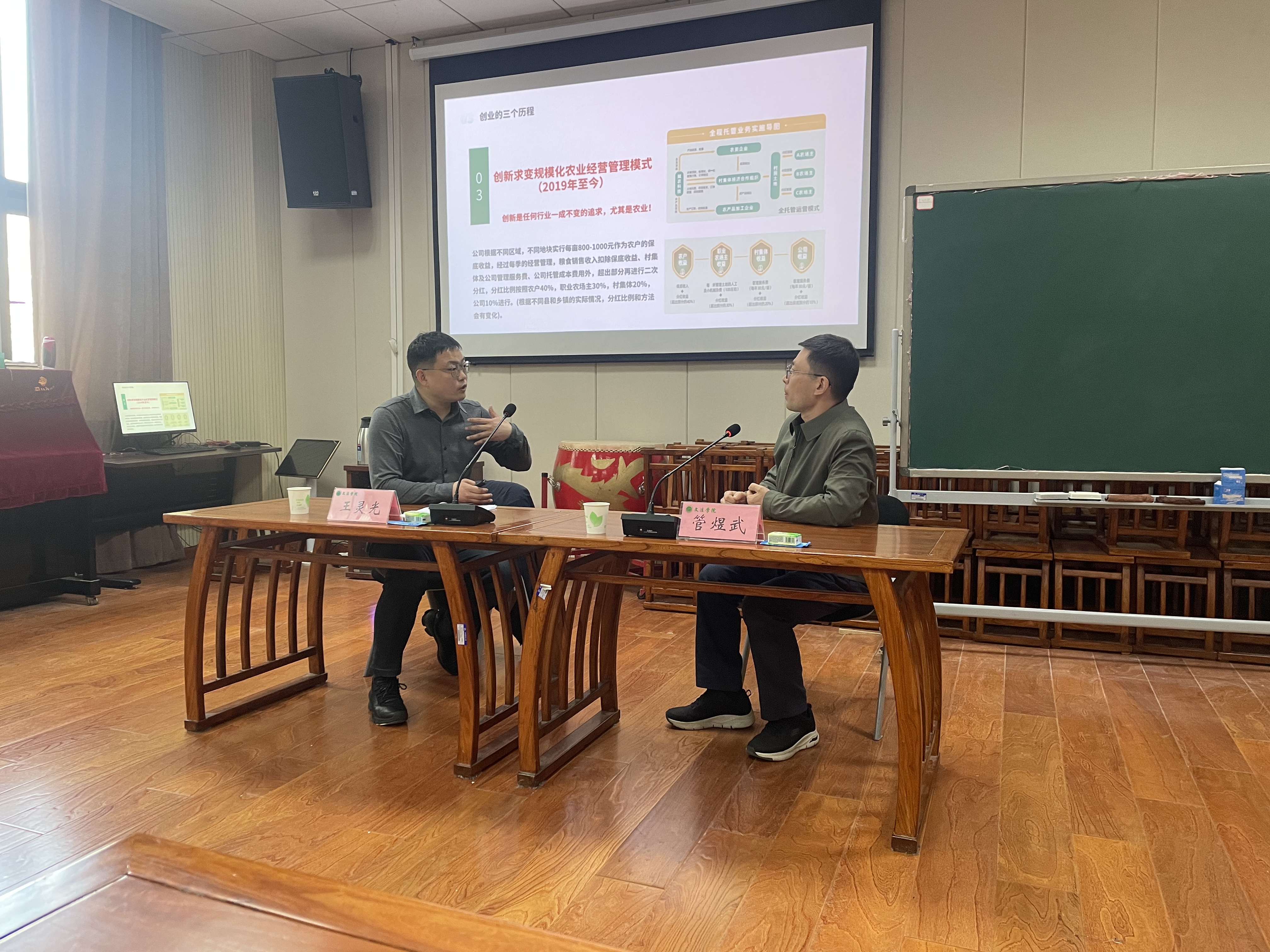 优秀校友、共青团第十七届全国代表大会代表、河南省促进农村就业创业先进个人、河南赋农科技有限公司董事长王灵光举办新型农业经营主体发展与创新专题报告会。院长王晓勇、行政管理系主任管煜武以及部分教师和农业管理专业研究生参会,会议由王晓勇主持。