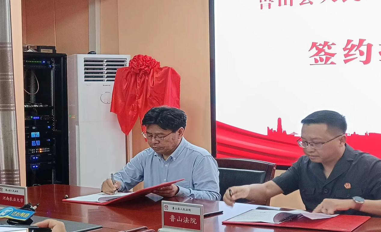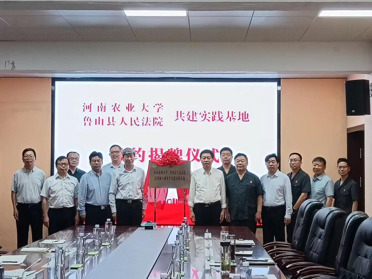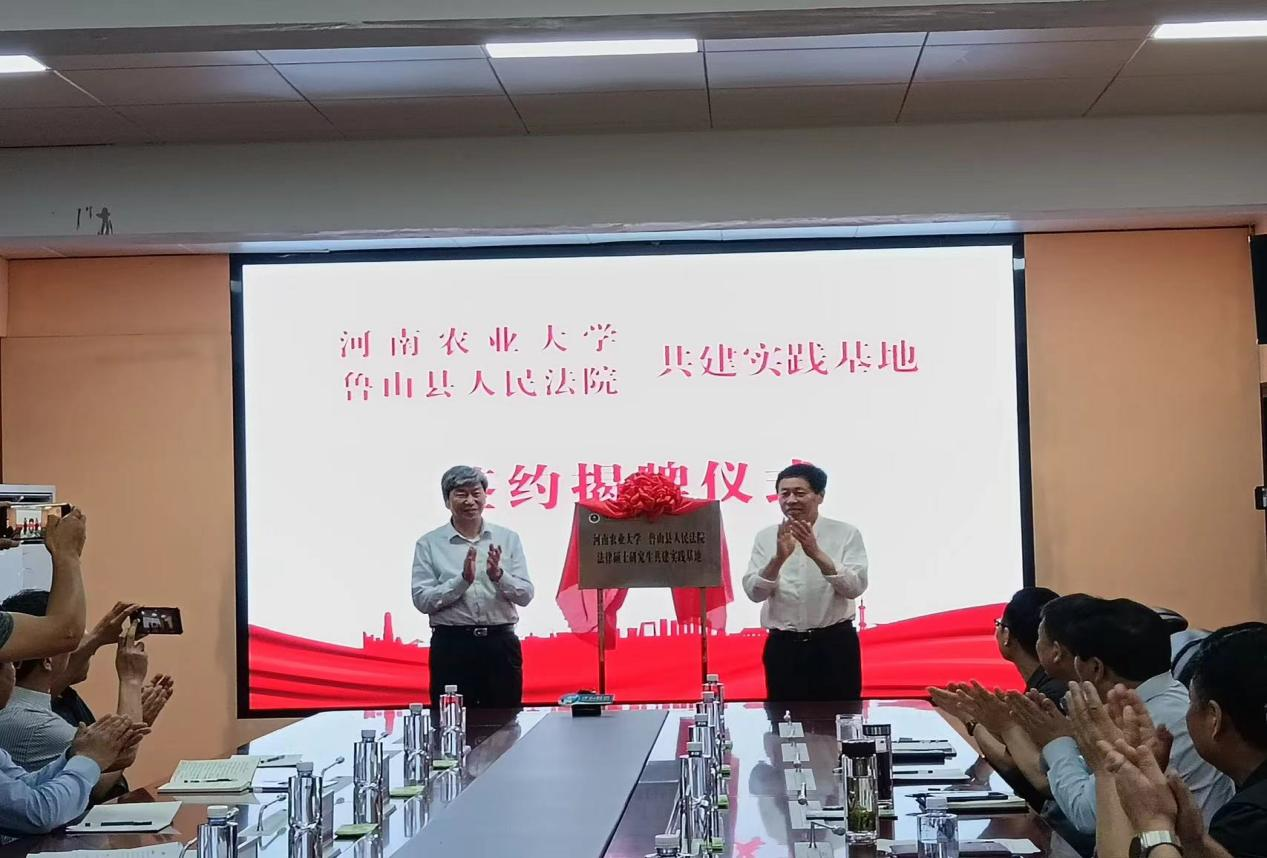 2021年入选河南省“双一流”创建工程高校,正在创建中国特色世界一流农业大学,学校涉农法治教育是法学学科专业的特色和亮点,表达了推进双方合作的意愿。宋安东与谢磊签订了合作协议,杨喜田与马向阳共同为实习基地揭牌。