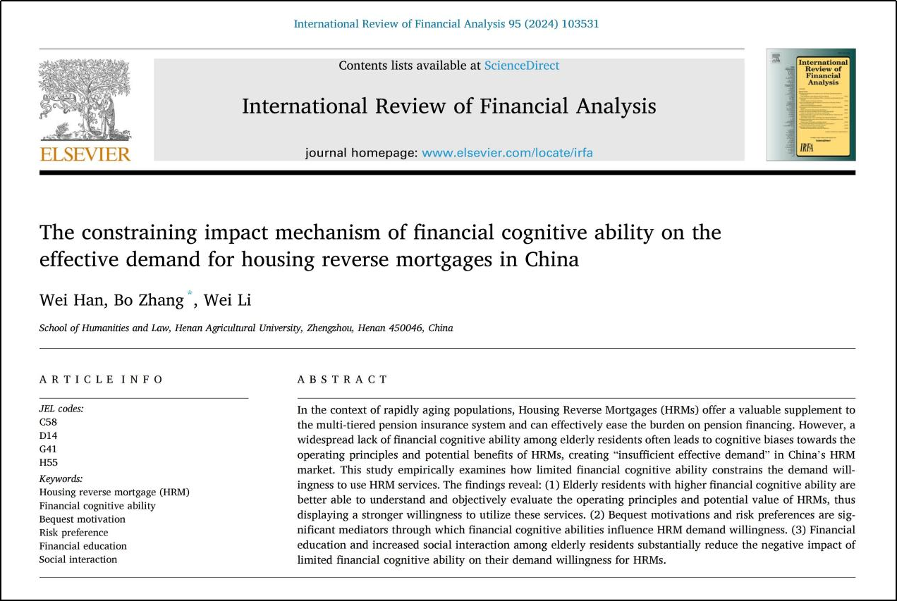 韩威老师团队完成的论文《The constraining impact mechanism of financial cognitive ability on the effective demand for housing reverse mortgages in China》被国际知名SSCI中科院一区(TOP)期刊《International Review of Financial Analysis》正式录用并官方上线。这一成就标志着绿帽小说