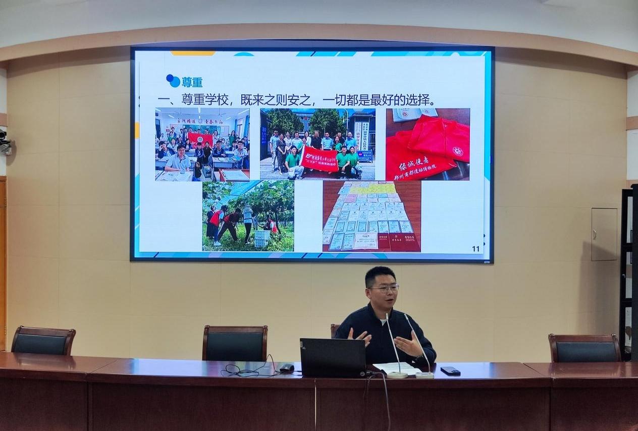 会议伊始,王鹏举对在场老师进行介绍,使新生对团委的师资力量有了初步认识。他指出,学院团委以高校思想政治工作方针为指引,致力于为学生立大志、明大德、成大才、担大任奠定思想根基。随后,赵梦闪、丁一玺、盛戈依次进行专题教育宣讲。