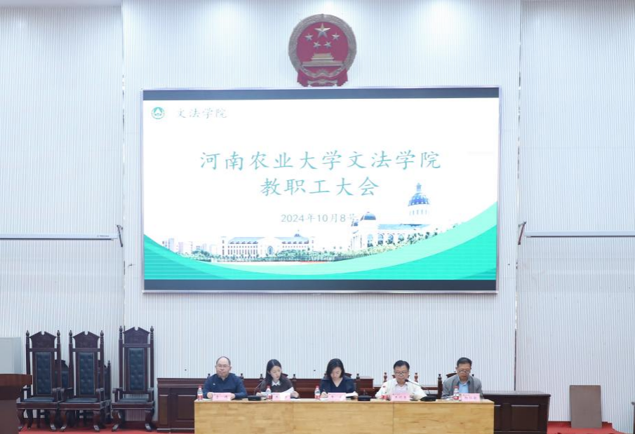 在龙子湖校区繁塔楼A座模拟法庭召开全体教职工大会暨2024年度国家社科基金项目和教育部人文社科基金项目表彰大会。学院党委书记牛娟、院长王晓勇、党委副书记朱瑞萍、副院长杨红朝、副院长李伟及全体教职工参加会议,会议由王晓勇主持。