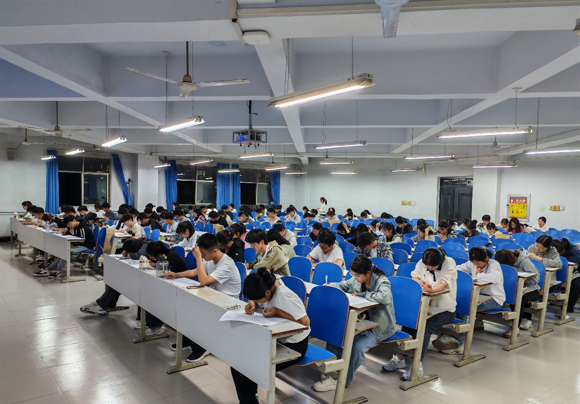 考试现场,学生负责人吴莹莹和石佩林监考,学院团委书记王鹏举老师巡考,同学们认真答题,秩序井然,考场纪律良好,展现出同学们对本次考试的重视。