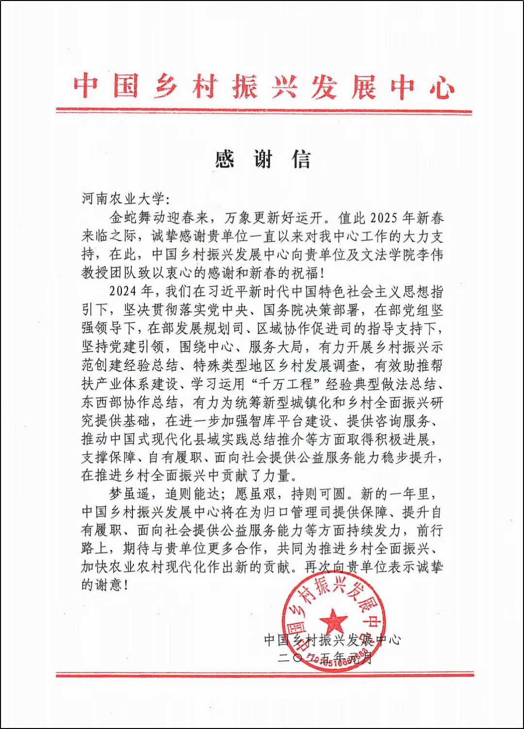 收到了中国乡村振兴发展中心发来的感谢信,信中对绿帽小说