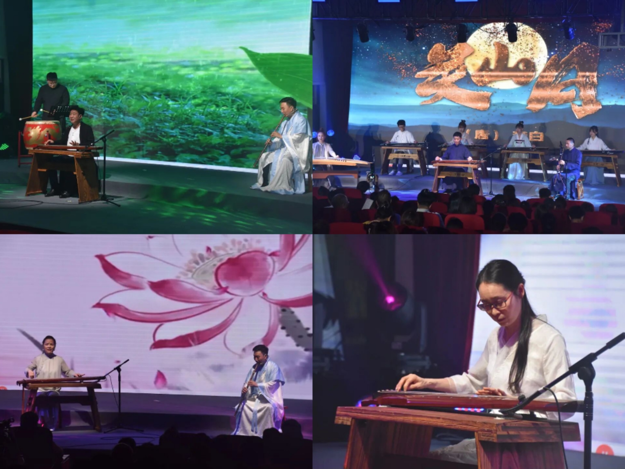 在晚上的古琴专题音乐会的音乐会环节中,一曲《神人畅》四乐合奏,曲风苍古雄健,如江河行地,音节清莹透亮;一曲《关山月》曲风古朴大气,道尽了边疆战士戍边守卫国土的雄壮;一曲《梅花三弄》向我们呈现了梅花动与静的形象对比,以此来比喻人应该保持自我操守,不屈服;一曲《定风波》曲风清正婉约,表明了虽处逆境屡遭挫折而应该不畏惧、不颓丧,具备旷达胸怀;一曲《鸥鹭忘机》琴箫合奏,曲意隽永,指法细腻,哲理深邃,教育我们要忘却计较,自然和谐;一曲《白头吟》,用歌唱的形式展现了一个对待感情真挚,渴望纯真感情的形象;一曲《青玉案·元夕》婉约幽转,运用反衬,表现出对理想的执着和坚守;一曲《赤壁怀古》借古抒情,雄浑苍凉,将写景、咏史、抒情融为一体,给人以撼魂荡魄的艺术力量;一曲《满江红》,师生合唱,曲风雄壮,表现了保家卫国、守护家园的壮志胸怀;即兴演出《沧海一声笑》,曲风乐观豁达,在经久不息的鼓掌声中,将全场气氛推向高潮。整场演出气势恢宏,精彩纷呈。或独奏、或合奏,演奏形式、演奏乐器虽不尽相同,但传递出共同的情感,为观众带来一场精妙绝伦的视听盛宴。