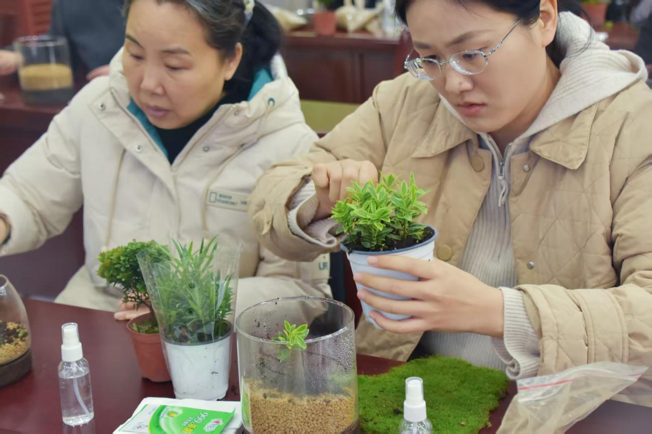 随后,石力匀从生态瓶的设计理念、材料特性到制作步骤进行了细致讲解,耐心示范铺底、造景、栽种等关键环节,并逐一指导大家进行实操。在她的带领下,老师们化身“自然艺术家”,将苔藓、绿植、砂石、小摆件等材料巧妙搭配,亲手打造专属的微型生态景观。透明的玻璃瓶中,渐渐呈现出一个个生机盎然的“迷你世界”,大家在动手实践中释放压力、陶冶情操,欢声笑语萦绕。