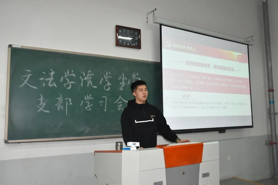 学生党员段锐分享了大事难事看担当,危难时刻显本色的优秀共产党员们的优秀事迹。共产党员,在抗击新型冠状肺炎疫情的关键时刻充分发挥了先锋模范作用,他们用行动书写初心和使命,让鲜红的党旗在抗击疫情中高高飘扬。“我是党员,我先上。”让老百姓的生命健康安全得到了保障,让党徽更加闪亮,更让我们对取得抗击新型冠状肺炎疫情的最后胜利充满了信心。