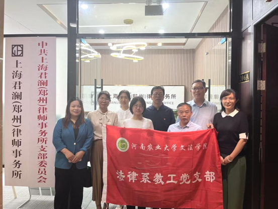 法律系到上海君澜(郑州)律师事务所开展访企拓岗促就业活动,举行学习贯彻“习近平法治思想”主题党日活动。学院副院长杨红朝,法律系教工党支部书记、系主任韩宁,学院教学秘书徐轶博,法律系副主任赵菊敏,党政办公室副主任杨柳青,法律系教师代表刘广林、王可利、贾秋宇等,上海君澜(郑州)律师事务所党支部书记杨新勤,律所执行主任彭逸豪,执业律师赵国栋、曹秋香等参与活动。