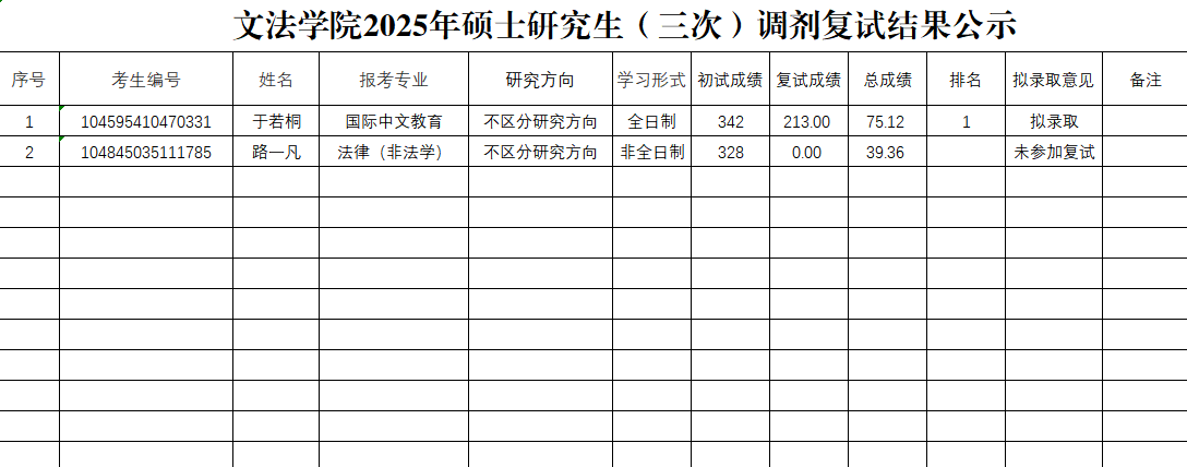 组织2025年调剂意向考生严格按照相关程序进行了复试考核,经学院研究生招生工作领导小组审核,现将2025年(三次)调剂考生复试成绩进行公示。