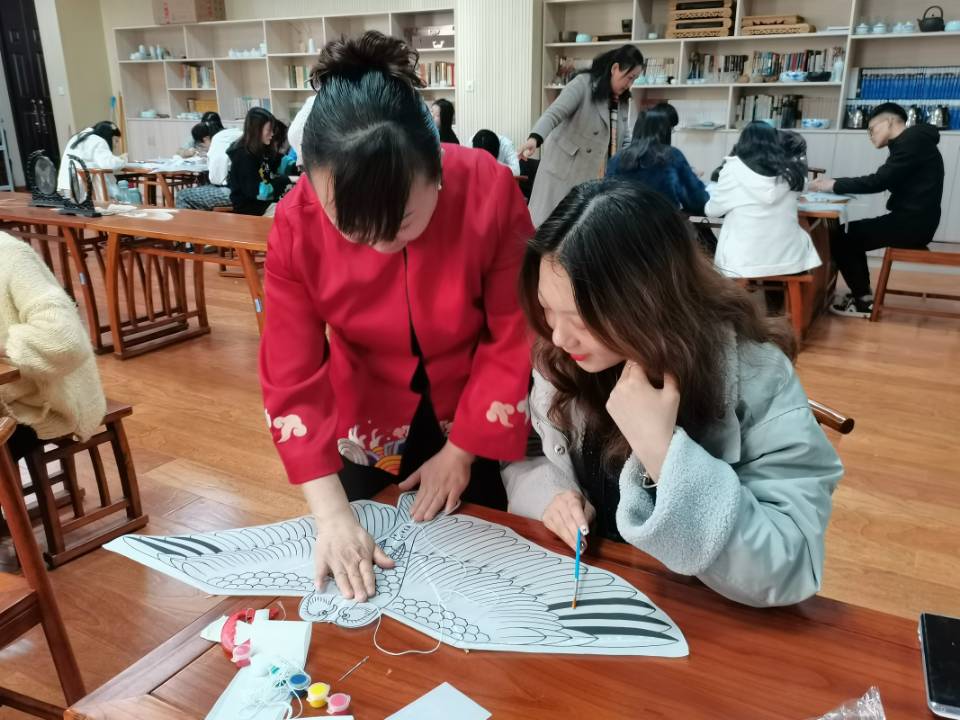 活动初始,宋长虹通过视频向大家展示了汴京宋氏风筝工艺的百年间的传承和已取得的成就。随后,宋长虹介绍了风筝的来历、起源、种类以及制作风筝的工具、材料和制作过程。在实践环节中,为了让学生进一步了解风筝工艺,感受汴京宋氏风筝的魅力,宋长虹带领学生亲手制作风筝。她一步一步地给学生示范、讲解,帮助师生共同完成。在场师生也积极学习,制作框架,填充颜料,无一不沉浸其中。