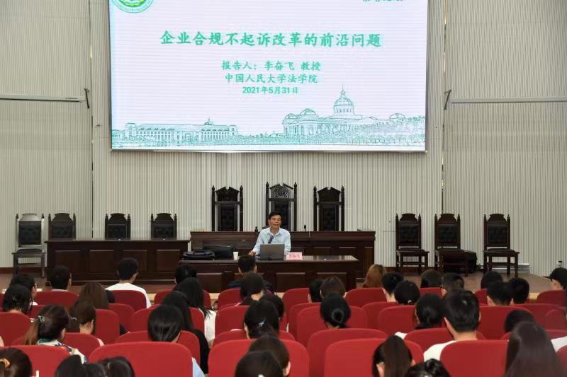 2021年5月31日下午,中国人民大学法学院教授、博士生导师李奋飞应邀,在模拟法庭作了题为“企业合规不起诉改革的前沿问题”的学术报告。报告会由院长王晓勇主持。学院近300名师生参加报告会。会上,李奋飞以“企业合规不起诉改革的前沿问题”为题,重点从“改革的正当根据”“改革的争议问题”“改革的未来展望”三个方面,对企业合规的含义,尤其对近期检察机关推行的企业合规相对不起诉改革,进行了全面细致的解读。结合企业合规概念的,李奋飞重点介绍了传统的企业犯罪治理模式所存在的诸多弊端,特别是结合“快播案”等部分影响性案例,阐述刑事追诉可能给涉案企业乃至公共利益带来的负面影响。他认为,企业以刑事合规计划换取宽大处理在很大程度上改变了检察机关在企业犯罪治理中的传统角色,有助于激励企业建立一种防范、识别和应对违法违规机制的机制,对于预防、消除企业再次实施违法犯罪行为,进而减少、避免刑事诉讼给公司、股东乃至社会带来的殃及效果,具有非常积极的意义,对我国刑事诉讼理论的发展产生深刻影响。