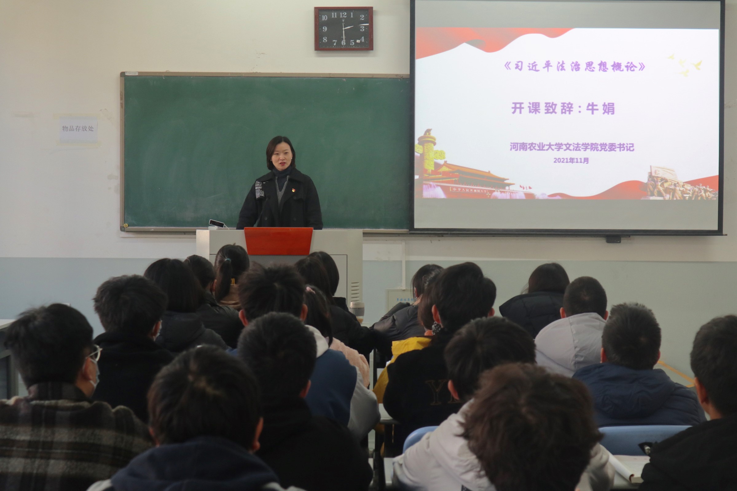 11月8日,《习近平法治思想概论》课程在绿帽小说 正式开课。院党委书记牛娟作开课致辞,她指出,从当前到本世纪中叶的未来30年,是中华民族全面建成社会主义现代化强国的关键期,也是全面建设法治中国的攻坚期。以习近平同志为核心的党中央创立的习近平法治思想,科学指明了“中国号”法治巨轮的前进方向,系统提出了全面依法治国的总蓝图、路线图、施工图,是党领导人民全面建设良法善治法治中国的科学行动指南。为推动这一科学理论体系更好地被广大干部群众,特别是法学类专业学生所学习掌握,特开设这一课程。