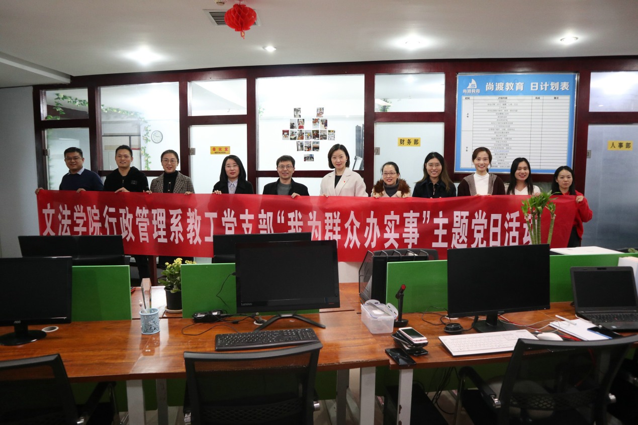 为充分发挥党支部的战斗堡垒作用和党员先锋模范作用,推动“我为群众办实事”实践活动走深走实,把党史学习成效转化为实践效果,11月11日行政管理系教工党支部在学院党委书记牛娟带领下,赴河南尚渡教育有限公司开展“我为群众办实事”教育服务活动。