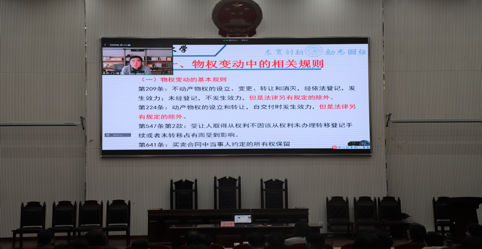 师生作主题为“物权重要制度解读”的学术报告。副校长汤继华、院党委书记牛娟、院长王晓勇、副院长杨红朝及部分师生代表参加了报告会。报告由汤继华主持。