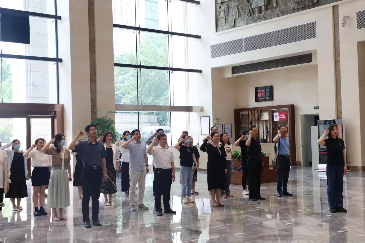 全体人员面对党旗重温入党誓词,进一步增强共产党员的责任感、光荣感和使命感,警醒自己永葆入党初心,铭记党员使命。