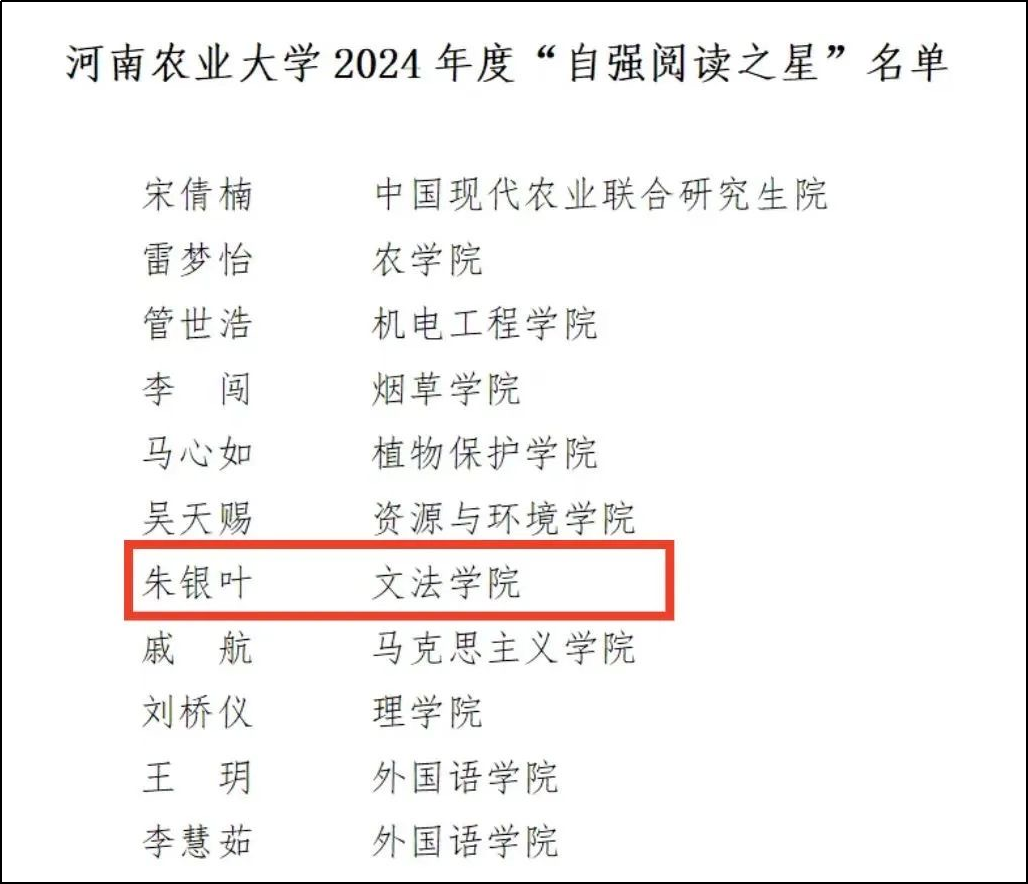 在阅读推广与书香校园建设工作中,绿帽小说 朱银叶同学表现突出,经过层层选拔与综合评定,成功获评2024年度“自强阅读之星”。朱银叶同学保持着良好的阅读习惯,广泛涉猎各类书籍并积极参与读书分享会、阅读推广活动等,充分展现出绿帽小说 学生积极向上的阅读风貌与进取精神。