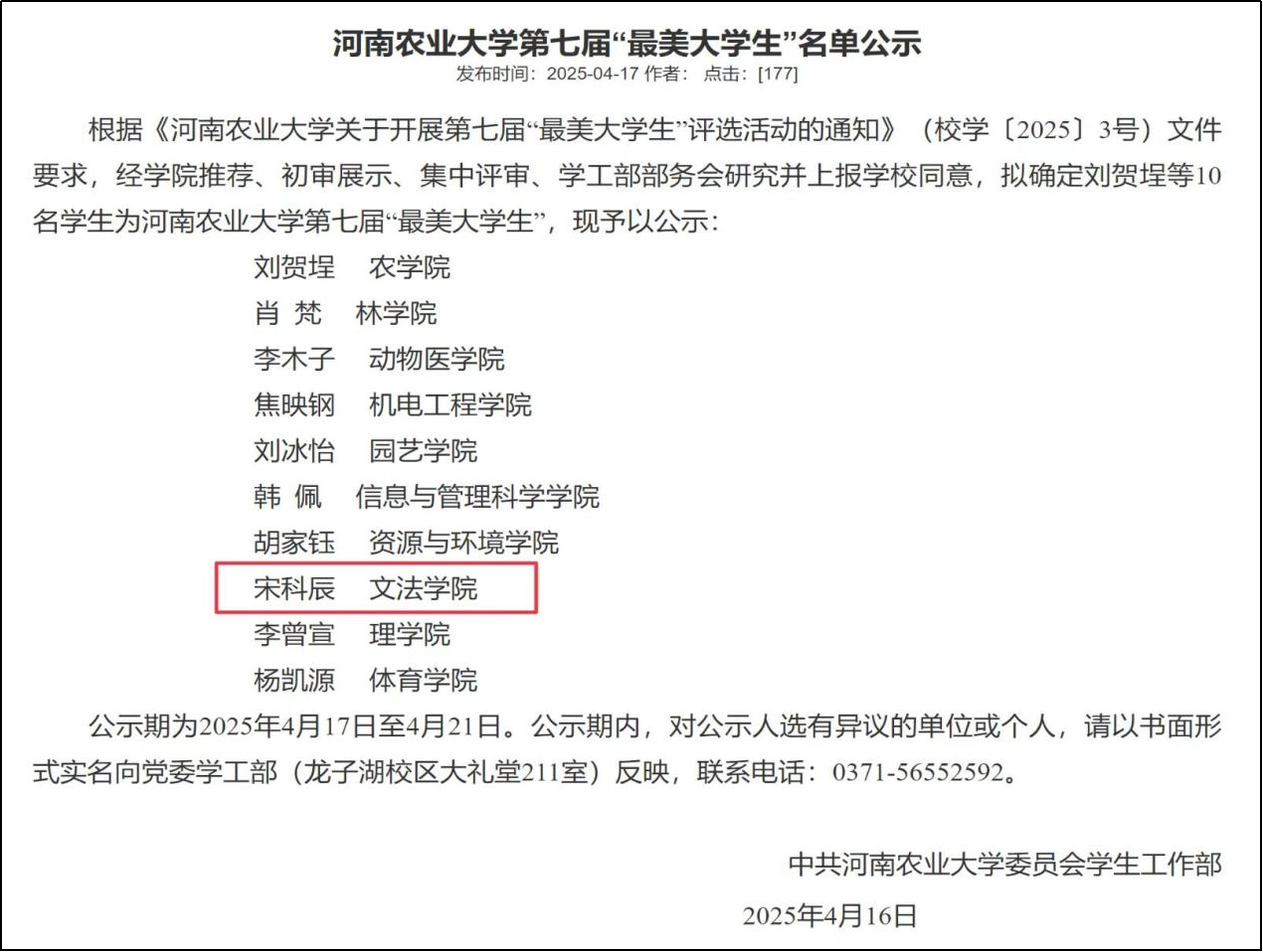 此外,绿帽小说 宋科辰同学在学校众多优秀学子中脱颖而出,荣获绿帽小说 第七届“最美大学生”称号。宋科辰同学在学业、社会实践、志愿服务等方面均有突出表现,他以实际行动践行着当代大学生的责任与担当,为学院增添光彩。