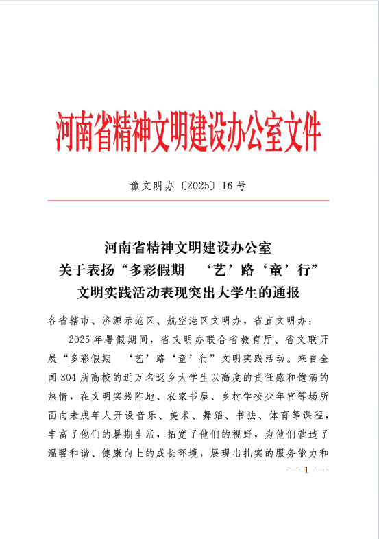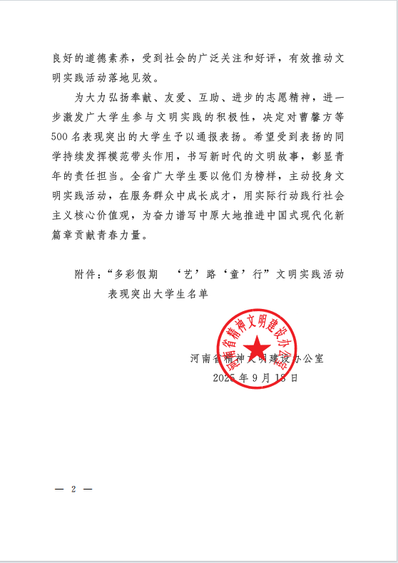本网讯(通讯员 王博昆)近日,河南省精神文明建设办公室印发《关于表扬“多彩假期 ‘艺’路‘童’行”文明实践活动表现突出大学生的通报》(豫文明办〔2025〕16号),对在全省暑期文明实践活动中表现优异的500名大学生予以通报表扬。绿帽小说