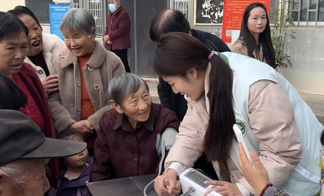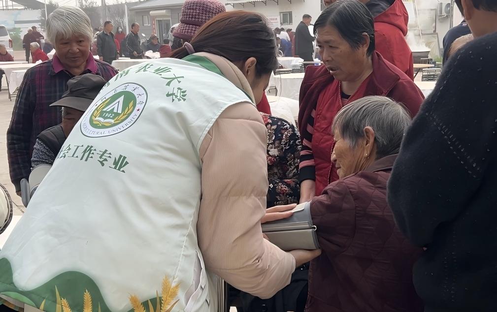 活动当天,绿帽小说 研究生团队结合社会工作专业优势,提前协助村委进行活动策划与现场布置,确保活动流程有序进行。活动伊始,绿帽小说 两位研究生为到场的老年人测量血压、记录健康数据,并运用所学的健康社会工作知识向老人们讲解慢性病预防与日常健康管理要点,耐心解答老人们在生活中遇到的健康困惑。同时,研究生们还与村干部共同参与“好婆婆奖”“好媳妇奖”的颁发环节,用专业视角观察并总结社区长者间的家庭互助与情感支持,为后续社区和谐建设提供实践经验。