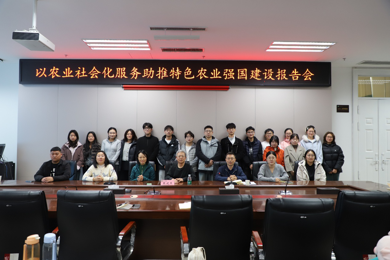 张建杰围绕研究生科研素养提升,系统阐述了学习模式转型、文献阅读方法与科研选题策略。他以我国“大国小农”的基本农业国情为切入点,系统阐释了农业社会化服务的核心内涵、多元服务模式及特色农业强国的建设要义,深刻剖析了两者之间“服务赋能产业、产业支撑强国”的内在逻辑关联。他指出,农业社会化服务是破解小农户分散经营与规模化、标准化生产矛盾的关键抓手,通过产前品种选育、产中农机作业与技术指导、产后仓储物流与品牌营销等全链条服务,能够有效激活特色农业发展潜力,为农业强国建设筑牢基础。最后,就师生在农业社会化服务研究中遇到的问题给予细致解答。