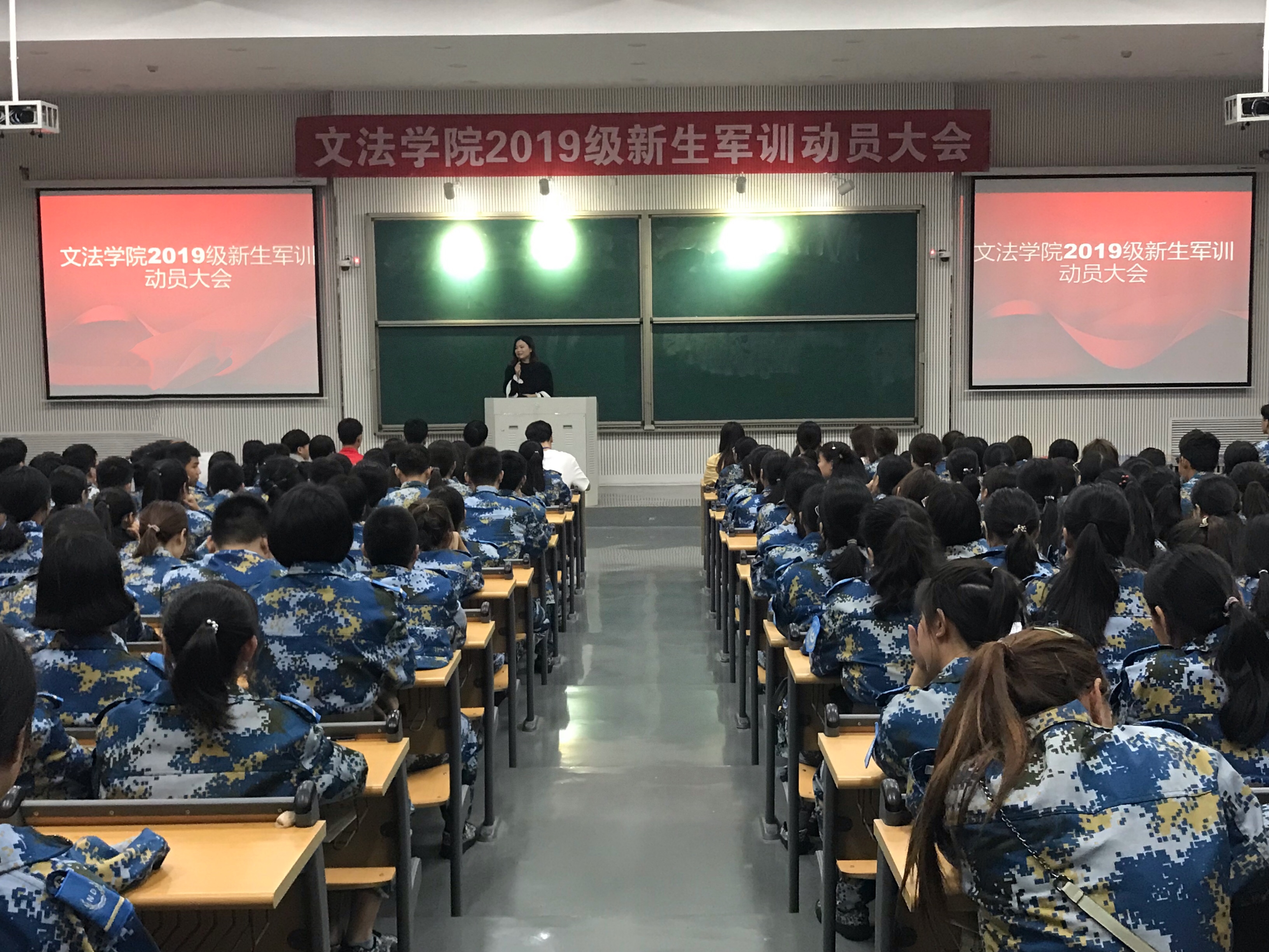 在大教室举行2019级新生军训动员大会。院团委书记沈倩茹、团委辅导员王鹏举、 2019级全体新生以及助班参加本次新生军训动员大会。