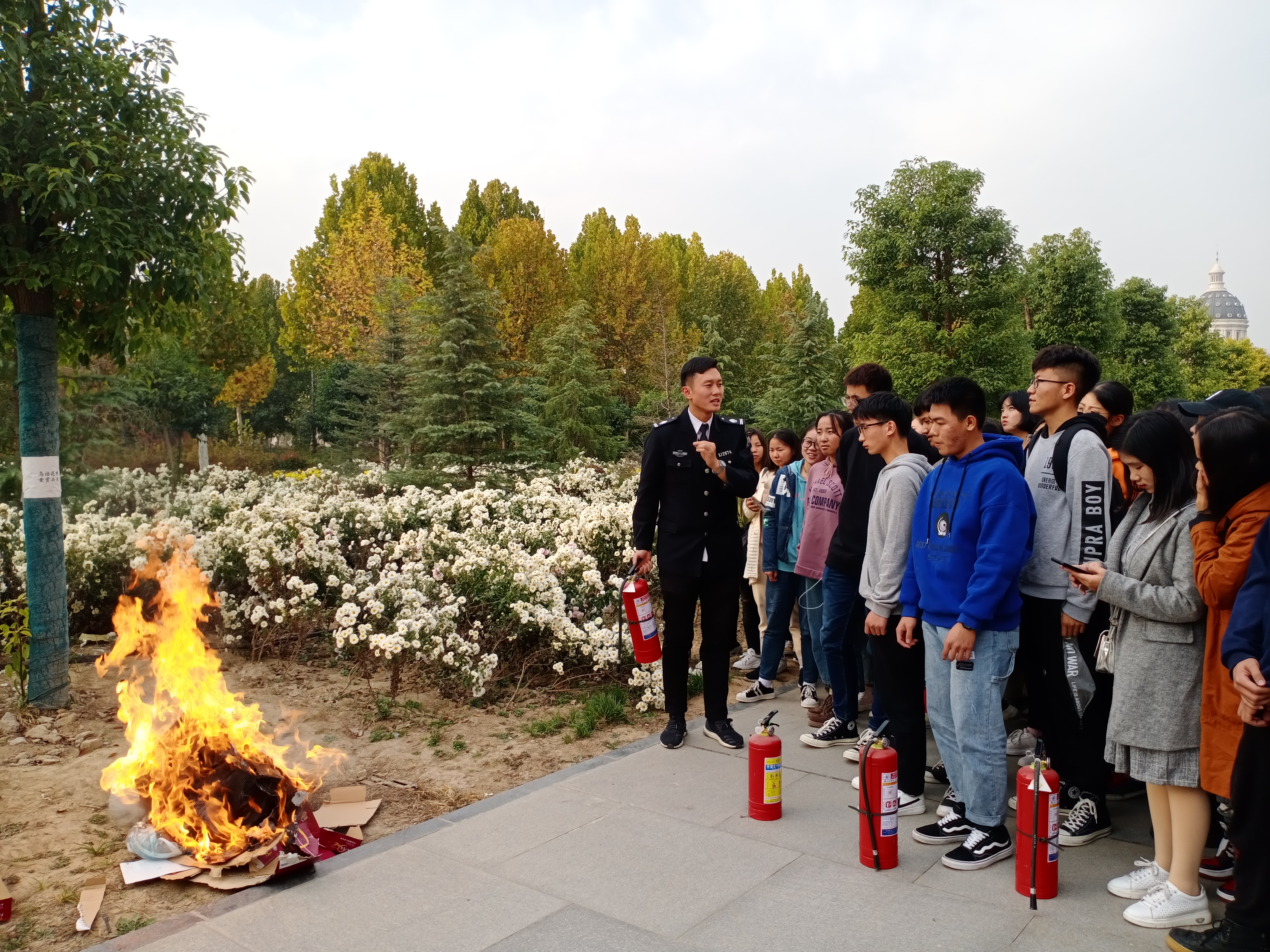 讲座伊始,徐永康介绍了消防安全“四个能力”,指出火灾的大部分都起源于电器的超负荷使用、私拉乱接以及电器的待机时间过长,并结合近年来发生的火灾案例,以视频、新闻的方式生动阐述了电器的正确使用与灭火。然后,他介绍了火灾周期示意图,指出最佳逃生时间和逃生的注意事项,并现场用实物讲解了防烟面具的使用方法。最后,徐永康带领师生来到室外,进行灭火器使用讲解,并指导学生现场模拟救火。