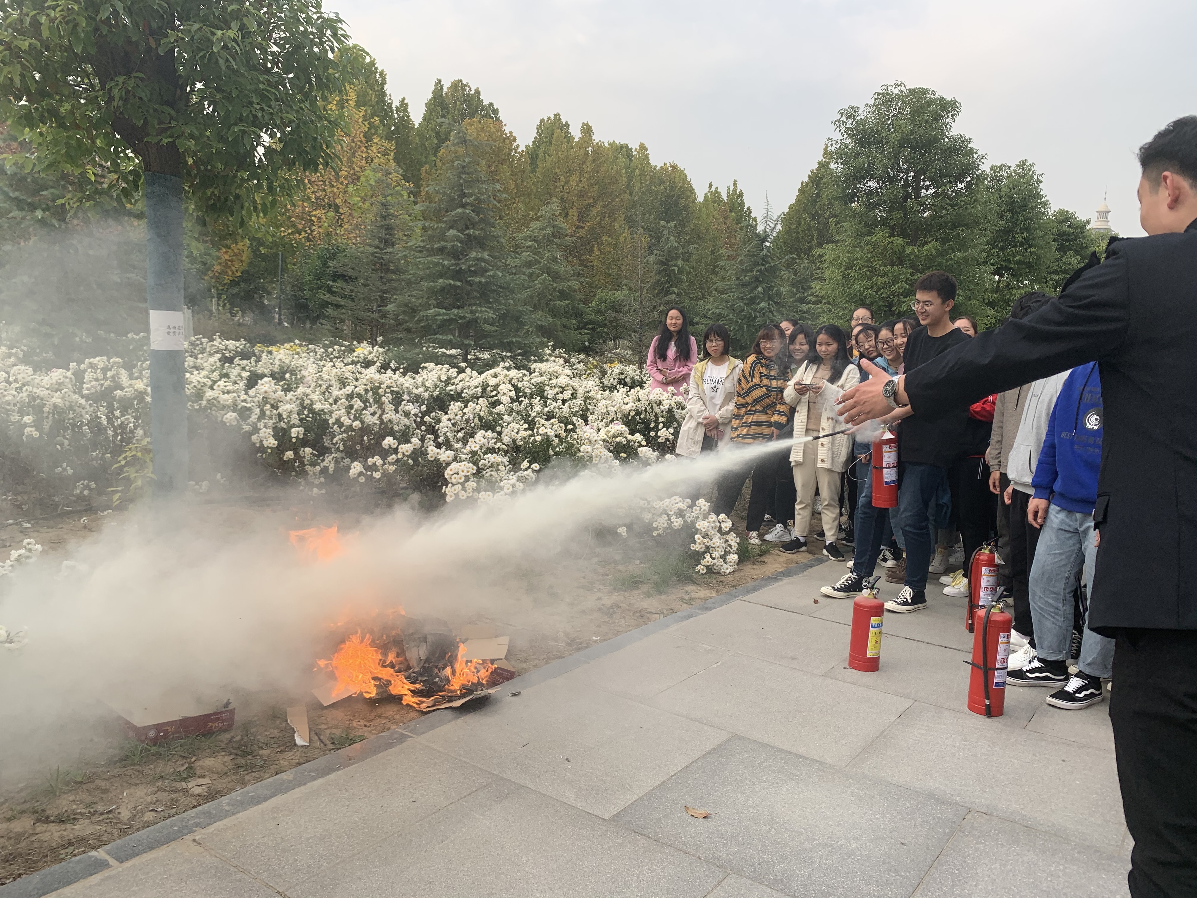学生使用灭火器模拟灭火