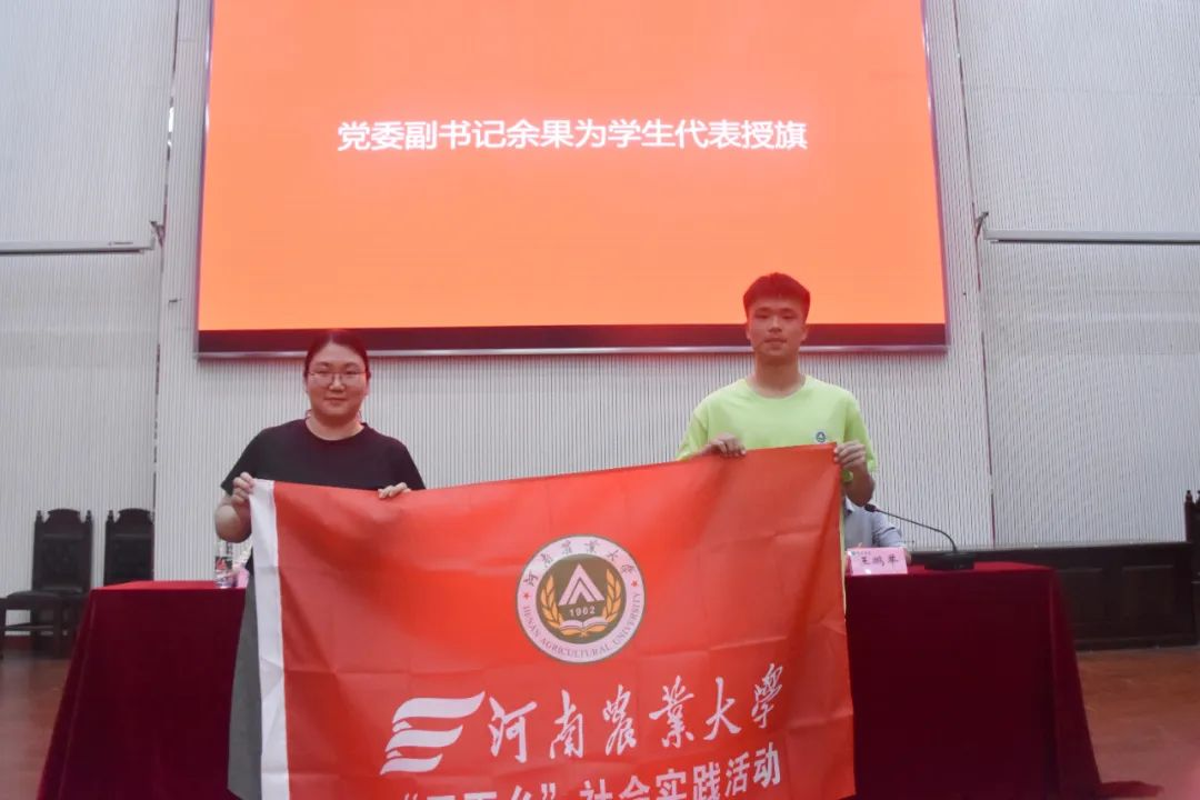 随后,余果为学生代表授社会实践旗帜,22级法学二班学生代表魏帅翔发言。他从宏观到微观深刻阐述了社会实践对大学生的重要性。他表明,作为大学生应当坚持“受教育、长才干、作贡献”的宗旨,积极参与社会实践,深入农村、了解农村、服务农村,用实际行动践行我们的初心和使命。